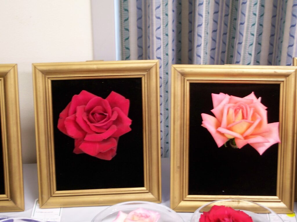 These can be displays of garden roses as they grow, like a spray of floribundas – or they can be tightly displayed as color splashes in a black painted picture frame. Many rose societies will use elegant bowls to highlight single blooms also.