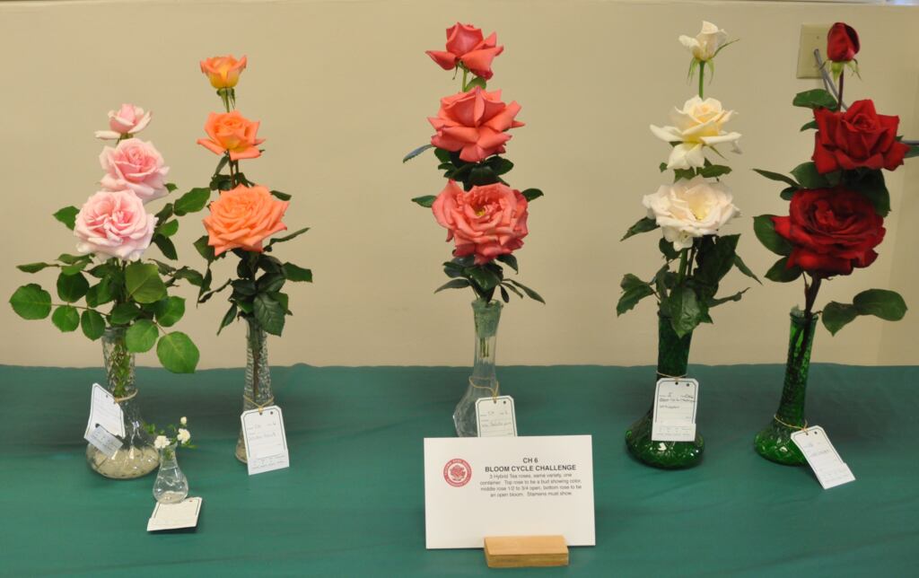 There might be other Sections that are unique to your local society. Every exhibitor honors the rules outlined in the printed Show Schedule from the Rose Show committee. That will tell you exactly how to display your beauties.