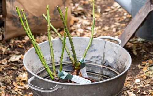 If you have purchased bare-root roses, they should be soaked overnight in water before planting. Any damaged roots should be removed, and all root ends should be snipped to promote hair root growth. If your rose is in a container and well-rooted, follow the instructions below – but try to keep the root ball intact.